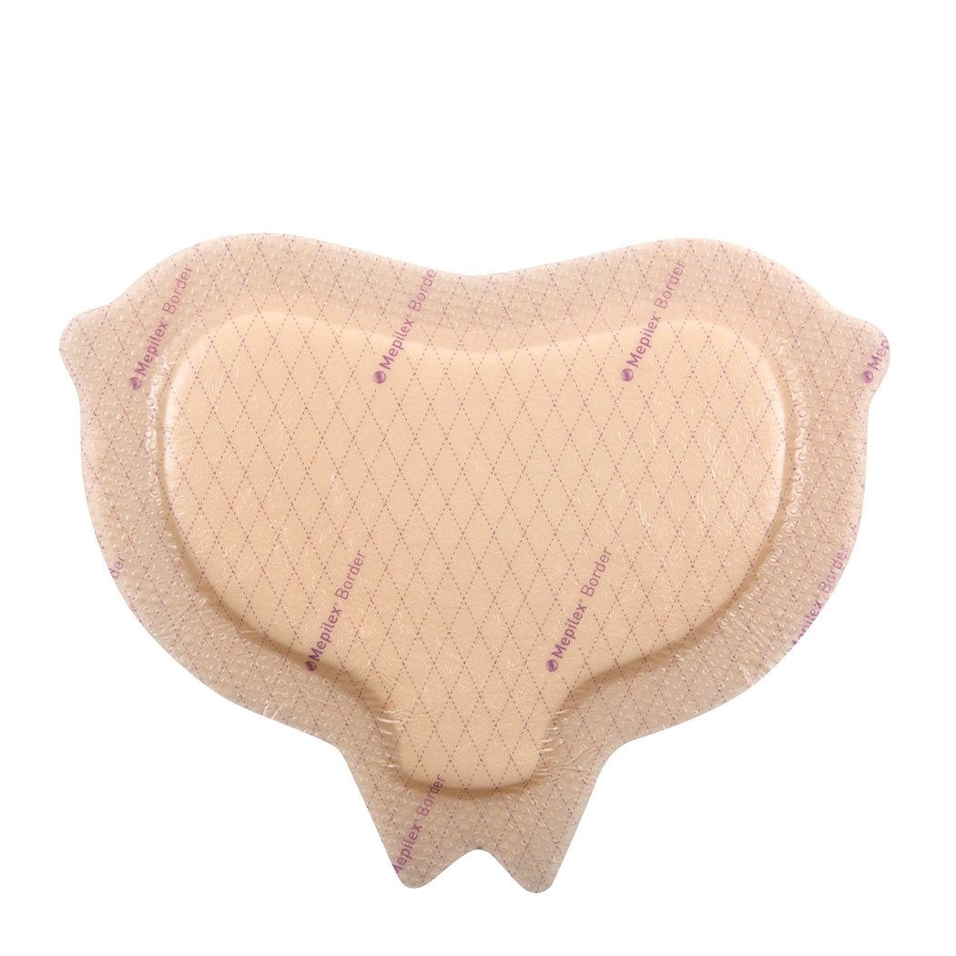 Product Detail : Mepilex Border sacrum self-adherent soft silicone foam dressing 9-1/5" x 9-1/5" , 6-1/2" x 7" 3-layered absorbent pad, sterile, shower proof.