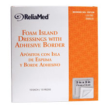 Product Detail : ReliaMed Foam Island Dressing with Adhesive Border. Highly absorbent and conformable hydrocellular foam dressings are ideal for moderately to heavily exuding wounds. Extra-soft, small pore foam minimizes lateral wicking of wound exudate. Adhesive border included for ease of application. Sterile, 3" x 3". 10/Box